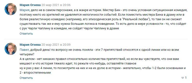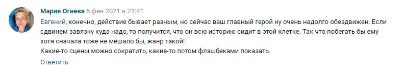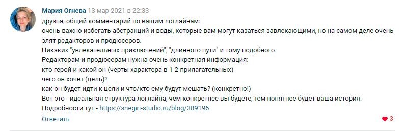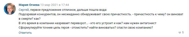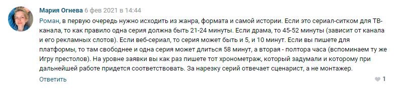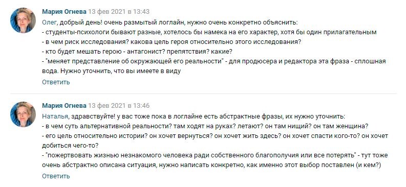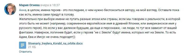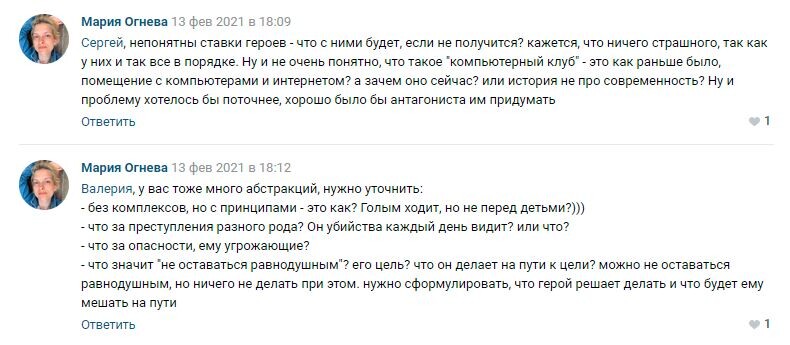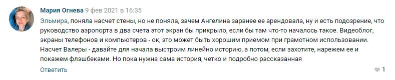 Дальше редактор читает работу и дает по ней консультацию: комментарии, пожелания, предложения. Может порекомендовать дополнительные материалы или примеры для изучения и улучшения своего сценария.